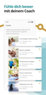 ATEM geht über traditionelle Anwendungen hinaus: Profitieren Sie von kompakten, leicht verständlichen Sitzungen mit begleitenden Video-, Audio- und beruhigenden Animationen, die Sie durch achtsame Atemtechniken führen. Was ATEM wirklich besonders macht, ist das personalisierte Coaching. Basierend auf Ihren individuellen Zielen – sei es besserer Schlaf oder Stressabbau – analysiert ATEM Ihre Atmung mittels der Smartphone-Sensoren und passt Ihr Übungsprogramm intelligent an. Dies gewährleistet eine maßgeschneiderte Unterstützung, die auch Aspekte wie die Zwerchfellatmung, physiotherapeutisch inspirierte Haltungskorrektur und Elemente aus Yoga Nidra für eine ganzheitliche Tiefenentspannung integriert.